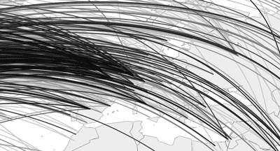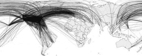 The Openflight.org airport network where the line colour is based on the number of routes (accessed on August 12, 2011). The code to replicate this image can be found at the end of this page. If you click on the image, a vector graphic version of it is available (pdf; 5.25mb).