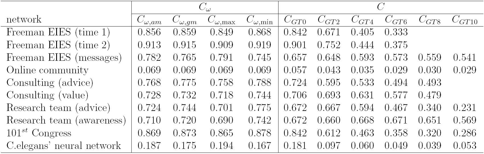 The first three networks are Freeman’s EIES networks (Freeman, 1978). The three networks are highly dense with densities (the randomly expected value of the clustering coefficient) of 0.78, 0.87, and 0.54, respectively. They also exhibit a fairly large tendency toward clustering; for the three networks is 0.8417, 0.9010, and 0.6569, respectively. When the proposed generalisation is applied, all three networks experience an increase in clustering: