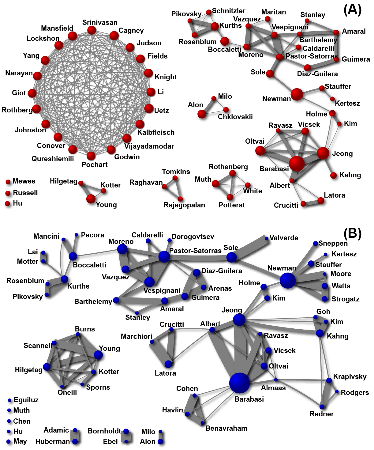 . Therefore, we adopt the Directed Weight reshuffle null model that also preserves this distribution. It is worth noting that the construction of this null model for the undirected scientific collaboration network is a methodological extension of the original procedure. As suggested in Section 3.2.1, a more appropriate null model might be reshuffling the two-mode structure instead the one-mode projection. However, only the one-mode structure of this network was available to us.