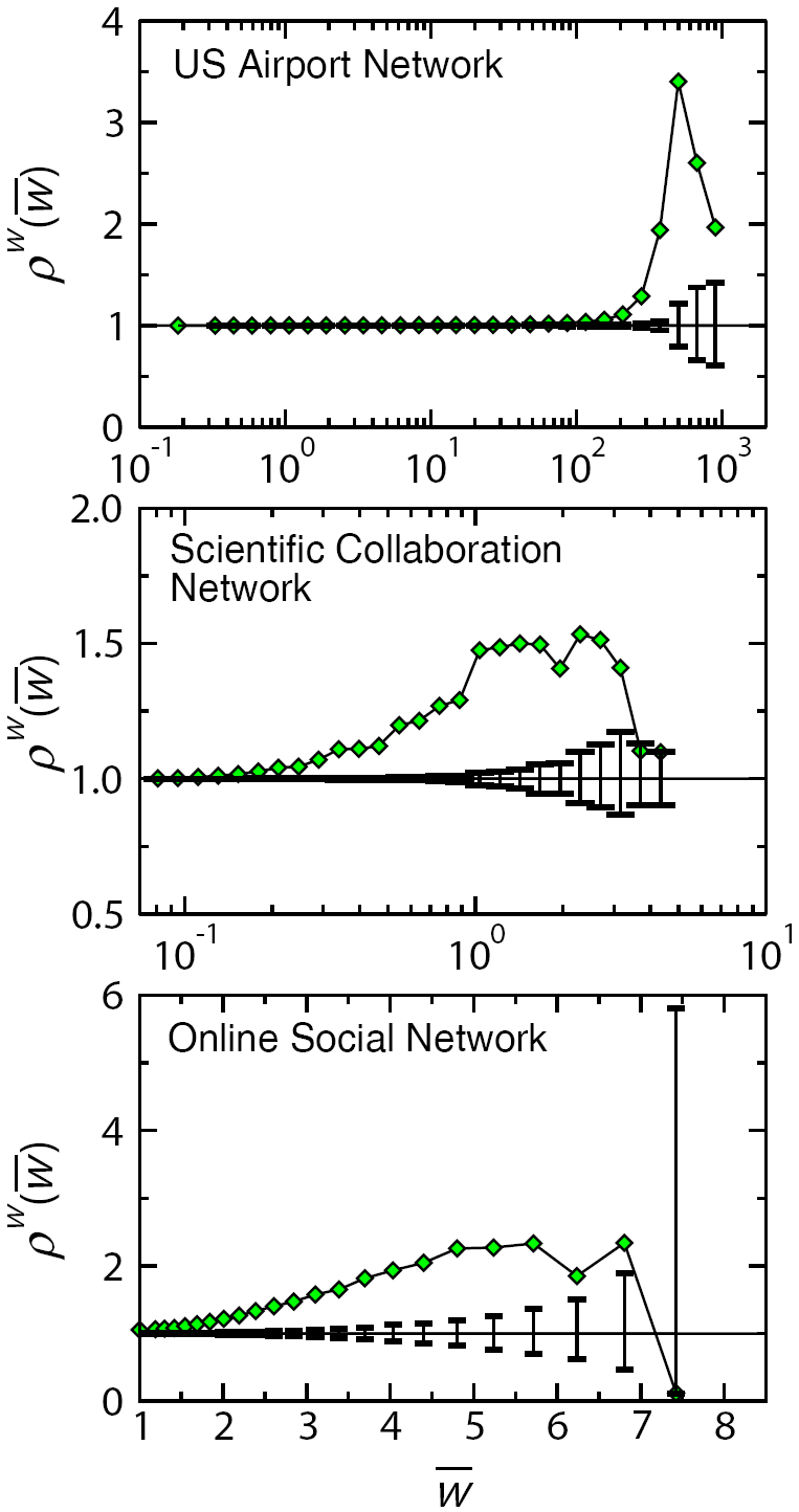 Figure 10 shows the weighted rich-club coefficient for all the three networks. The airport network displays a positive signal which substantially departs from the random baseline only at high values of the average weight. Airports characterised, on average, by very busy routes tend to direct these routes to one another.
