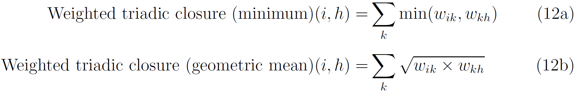 All of the terms that were previously used in the analysis of network evolution were designed for binary networks. However, some of them can be generalised to weighted networks. As shown in Chapter 2, a triplet value can be used to differentiate triplets. We proposed four methods for determining the triplet value. It can be the arithmetic mean, geometric mean, the maximum, or the minimum of the two weights that compose the triplet. Building on Opsahl and Panzarasa (2009), Snijders and Steglich (2008) used the concept of a triplet value to model triadic closure in a proposed extension of the SIENA model to weighted networks. They used the minimum and geometric mean methods for defining the triplet value and for the ()-dyad summed the values of the triplets that originate at node i and terminate at node h. These terms can be formalised as follows: