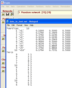 To export your data from Pajek to tnet, you must first save the network in a Pajek .net file, you can do this by going to File > Network > Save, and selecting a location. In this example, I will use c:\data_to_tnet.net. Then you need to open the .net file, e.g. c:\data_to_tnet.net in Notepad as shown on picture to the right. You need to delete the lines from “*Vertices” to, and including, “*Arcs”, so that all you have left is three columns with numbers. Then save the file.