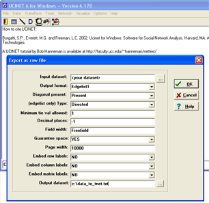 Second, an exclamation mark at the end of the outputted file must be manually removed. UCINET adds an exclamation mark at the end of each file, and this cannot be read by R/tnet in a simple way. One way of doing this, is to open c:\data_to_tnet in Notepad, and delete the last line (this should just be !).