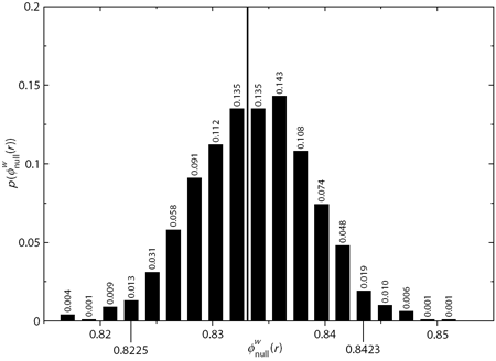Although the above results indicate that there is a weighted rich-club effect, it is important to check whether the results are statistically significant. Statistical significance can be tested using the distribution of values from the random networks. Below is the distribution of coefficient from 1,000 random networks. If the observed coefficient is outside the 95 percent confidence interval, it could be deemed statstically significant. In the above example, the confidence interval always crosses 1, which means that the results are non-significant.